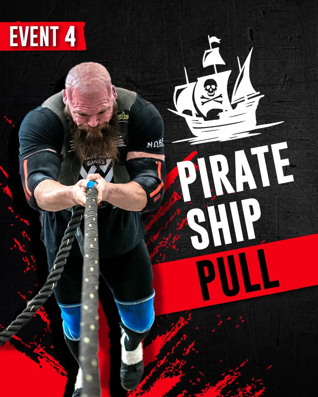 Athlete will pull a pirate ship 50ft / 15.25m in the fastest time within a 60 sec time limit.