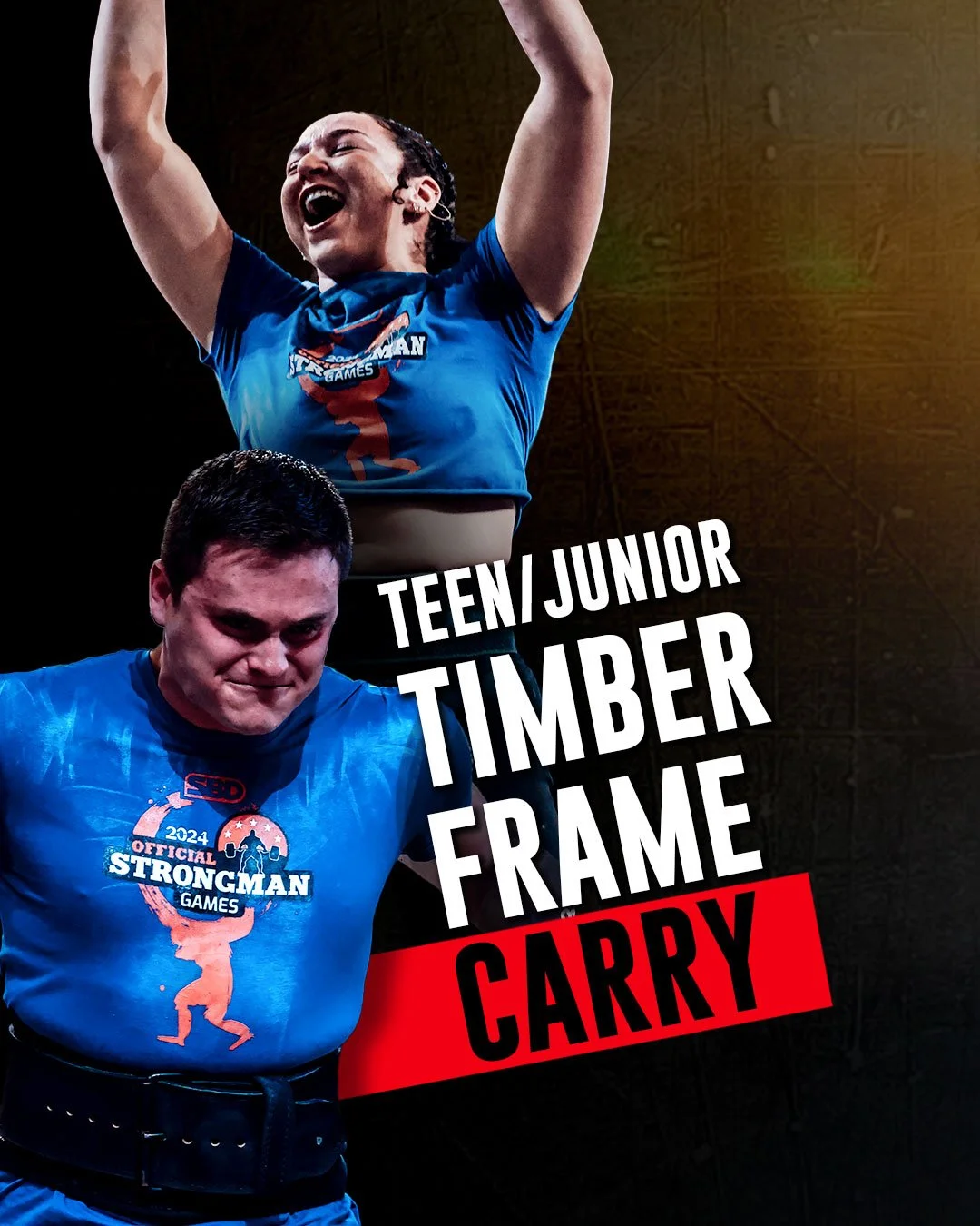 Teen/Junior athletes will carry a Timber Frame down and back a 50ft / 15.25m course, for a total distance of 100ft / 30.5m, within a 60 sec time limit.