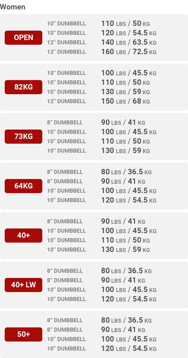 • Score will be the total number of dumbbells completed and time. Split times are taken at each successful lift.