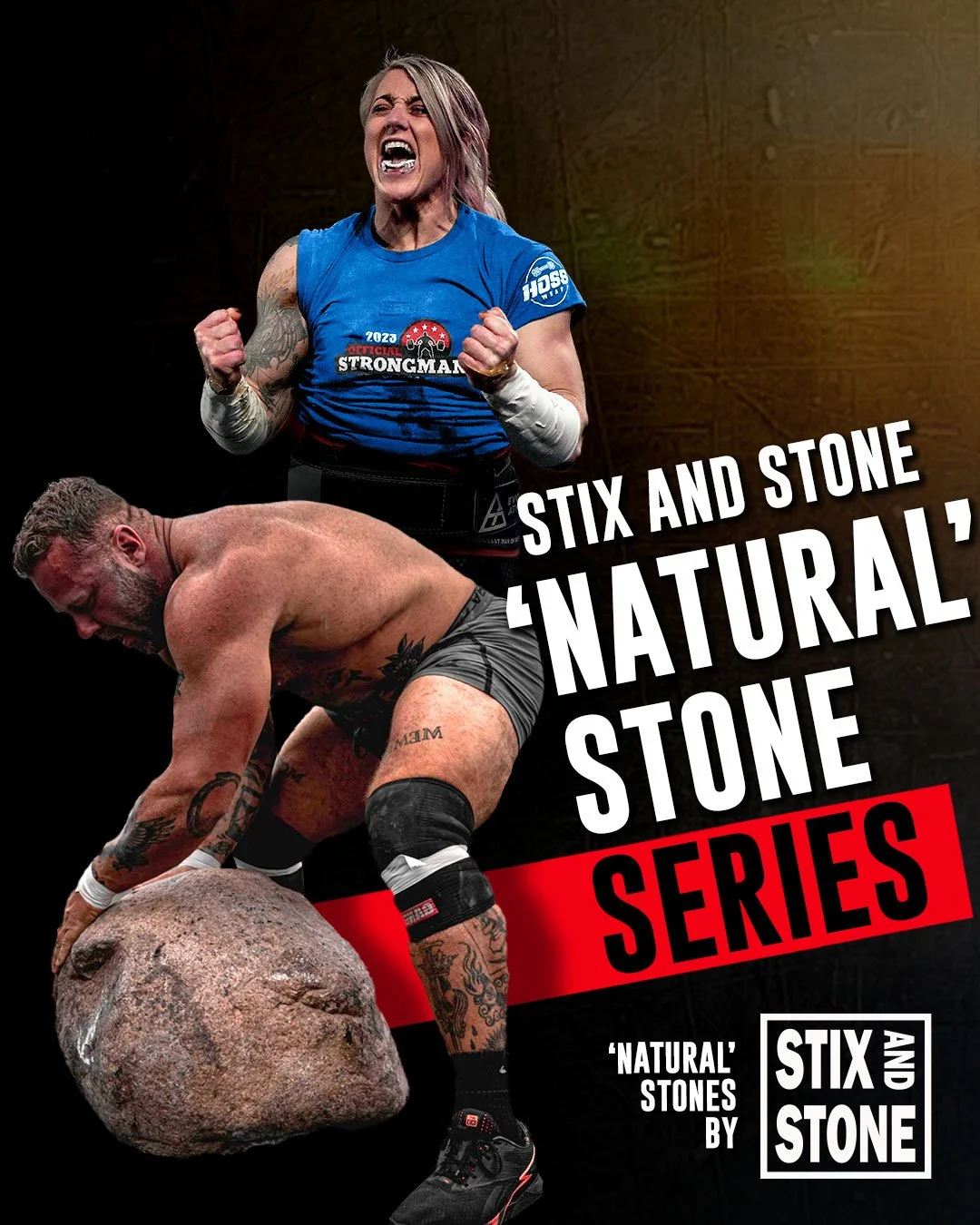 ‘Natural’ stones are formed from concrete molds designed to mimic stones found in nature and chosen for Strongman loading. Handmade by Stix and Stone.