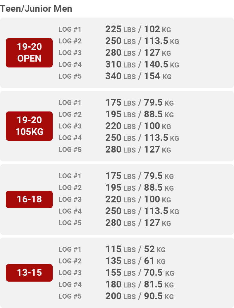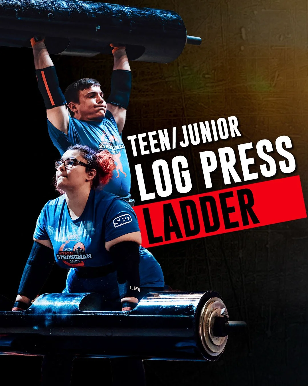 Teen/Junior athletes will clean and press a series of 5 logs, increasing in weight, in the fastest time, within a 60 sec time limit.