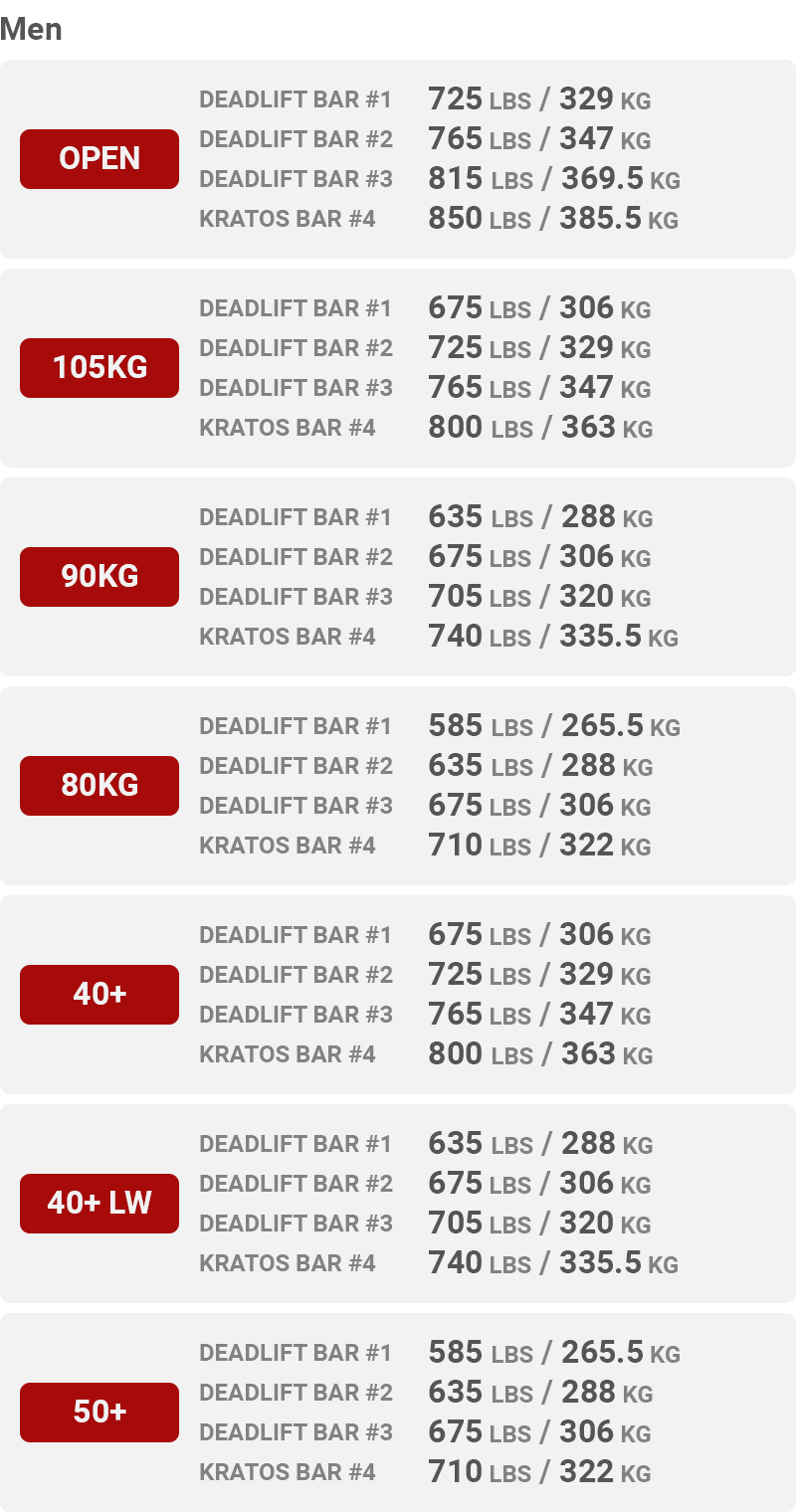 • Once time begins, athletes will deadlift each bar, in ascending weight order, to full lockout.